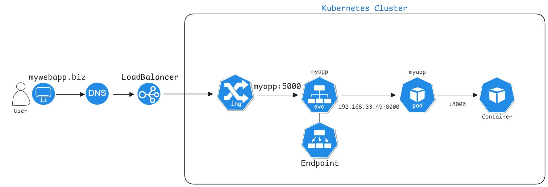사용자가 mywebapp.biz로 접속한다면 Ingress가 사용자의 트래픽을 클러스터에 배포된 myapp Service의 5000 포트로 보낼 것이고, mywebapp.biz/blog으로 접속한다면 blog Service의 5002 포트로 보낼 것이다.