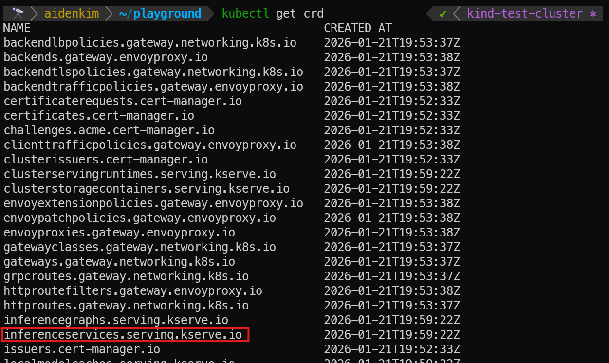 KServe가 설치되면서 InferenceService CRD도 함게 배포되었다는 것은, 나중에 이 CRD를 통해 실제 InferenceService 리소스를 생성해서 클러스터에 배포할 수 있다는 뜻입니다.