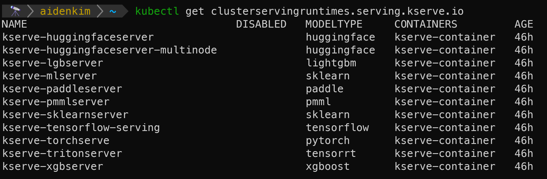 그래서 KServe가 설치된 클러스터에서 어떤 ML 모델 유형을 지원하는지 알고 싶다면 kubectl 명령어로 직접 확인할 수 있습니다.